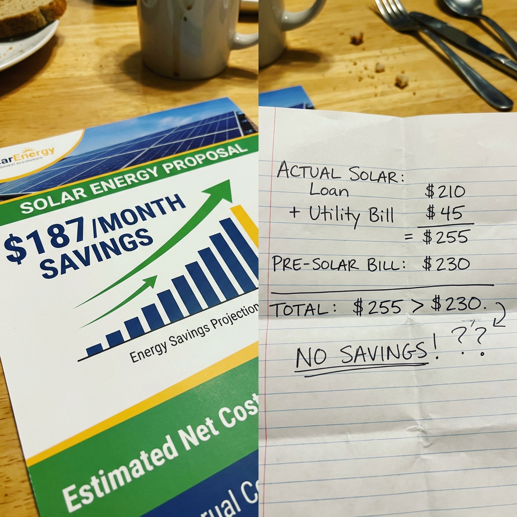The salesperson sat at your kitchen table, pulled up a projection, and showed you exactly how much you'd save — $150 a month, maybe $200. Your utility bill would drop dramatically. The system would essentially pay for itself.